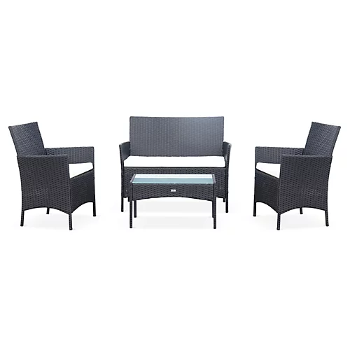 The Moltรจs garden set is suitable for small areas. It is trendy and space saving. Its affordable price and value are very appealing. It allows everyone to equip their terrace with a stylish and quality product. It can be integrated both indoors and outdoors. The Moltes is comfortable to sit on thanks to its 8 cm thick seat cushions. This set offers great comfort and can fit on small terraces or balconies. Polyrattan is a resistant synthetic material of fine quality. It was designed to withstand both sunlight (UV rays) and water damage (rain/snow/salt water). Its resemblance to natural rattan gives this material a chic and modern appearance making it perfect for both indoor and outdoor use. The entire metal frame is made from galvanised steel and has been coated in epoxy paint to prevent rust formation. We have carefully selected the best quality materials from our suppliers to weave our furniture offering you exceptional durability. The cushions are all water resistant with zipped covers for easy removal. The coffee table comes with a 5mm frosted tempered glass top (5x stronger than traditional glass). The set comes delivered in a self assembly. Rattan colour: BlackCushion colour: Off white1 x Sofa: W106 x D60 x H84cm (8.5kg)2 x Armchairs: W59.5 x D60 x H84cm (6.4kg)1 x Coffee table: W71 x D41 x H39cm (6.3kg)Height of the seat: 46cmFrame material: Galvanised steelMaterial: Woven polyrattan