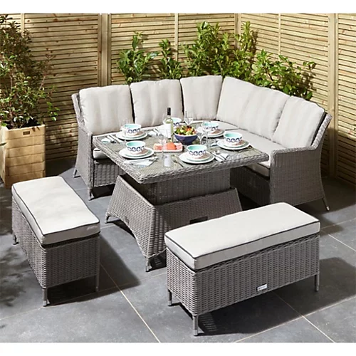6 Seater Natural Stone Rattan Weave Corner Garden Dining Set – With Benches