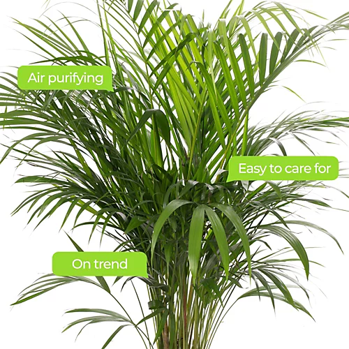 Areca Palm (Dypsis lutescens) is a popular tropical palm known for its graceful feathery fronds and its ability to purify the air. It features arching, bright green leaves that create a lush and tropical appearance. The Areca Palm is well-suited for indoor use and can thrive in a variety of settings.