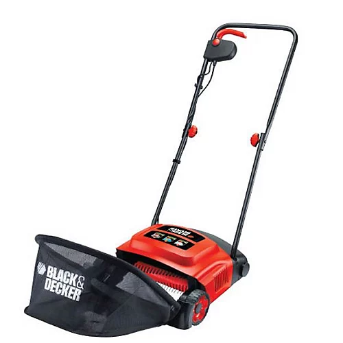 Specifications of Black Decker 600W GD300 Electric Lawnraker Raking Width 30 cm. Power 600 W. Raking mechanism Metal tines. Deck Material Plastic. ‘Lock on’ switch Yes. Working Height 2, 3, 8 mm. Rear Roller Yes. Collection Box 30 L. Height settings Central. Cable retention UK only. Cable length 10m. Weight 7 kg.