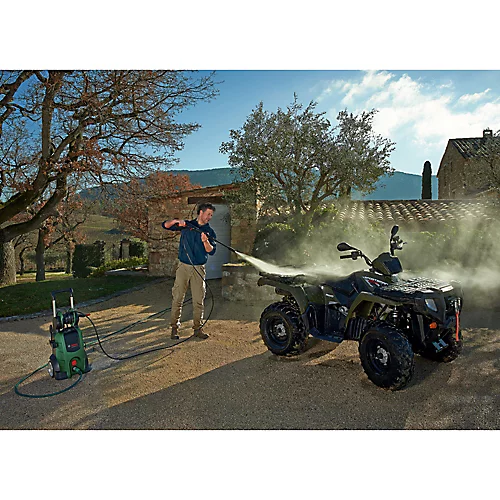 The Advanced Aquatak 140 cleans hard, stubborn dirt on a range of surfaces, including large cars, patios, and driveways. Its large wheels and metal telescopic handle also offer exceptional mobility for easier use around the house. Push-fit connections and in-use gun storage make cleaning simple.