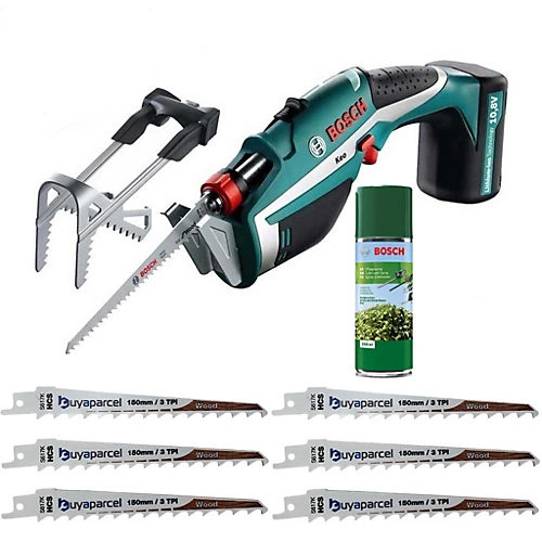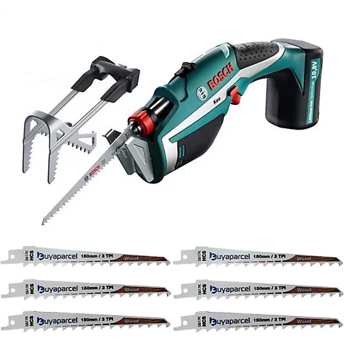 Specification of Bosch Keo Cordless Garden Reciprocating Pruning Saw Plastic carrying case Charger Bag to store the saw blades Battery type Lithium-ion Battery voltage 10,8 V Cutting capacity (with A-Grip ) max. 60 mm diameter Cutting capacity (without A-Grip ) max. 80 mm diameter Cuts per battery charge (15 60 mm diameter) 30 190 Saw blade length 150 mm Battery charge time 3 h Weight (with A-Grip ) 1.050 g Sawing chipboard Vibration emission value ah 19.0 m/s Uncertainty K 6.0 m/s Sawing wooden beams Vibration emission value ah 20.0 m/s Uncertainty K 3.0 m/s Specification of Reciprocating Sabre Saw Blades Length: 150mm (6in) Teeth: 3 TPI