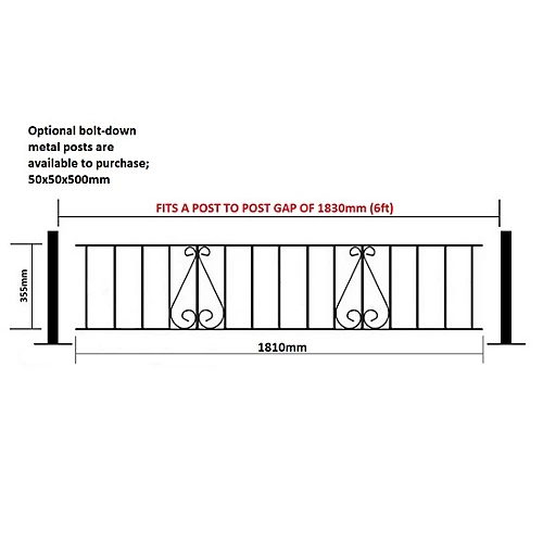 Scroll style metal garden railing panel. Fits a post to post Gap of 1830mm x 355mm High. Electro-galvanised for added rust resistance and powder coated black. Galvanising is not a 100% rust proof guarantee, if the coating is damaged or chipped it will need to be touched up. Fittings included to mount to brick work or metal or wooden posts, no screws included.