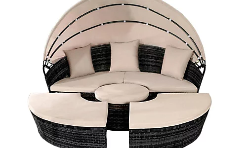 This deluxe rattan set is a pure delight to have in your garden. It is UV resistant so will protect you against the hot summer sun as well as being waterproof for when the great British summer comes into full swing. It’s retractable sunroof ensures protection whatever the weather. This piece of luxury also includes backrest cushions for extra comfort. It is made from poly rattan mesh on a steel frame. This set has the option to add a cover to it which is perfect protection for this rattan during those not so sunny days