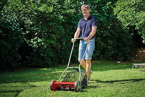 The Einhell GC-HM 400 cylinder lawn mower is a robust, functional lawn mower without a motor drive, for the clean, quiet and also environment-friendly mowing of lawns of up to 250 mยฒ in size. The ball-bearing mounted mower spindle with 5 high-grade steel blades is designed for a cutting width of 40 cm. The cutting height adjustment facility with 4 levels can be adjusted to individual requirements between 13 mm and 37 mm. The plastic roller has a diameter of 46 mm. The cylinder lawn mower has lawn-friendly large wheels. A curved long handle provides optimum on-the-job ergonomics. There is a parking position for easy and secure storage of the lawn mower. The 27 litre grass catch basket is removable and easy to empty.