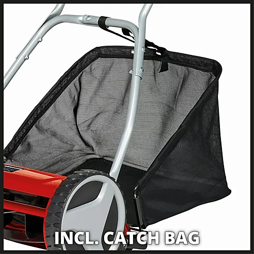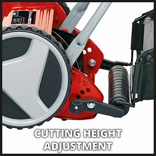 The Einhell GC-HM 400 cylinder lawn mower is a robust, functional lawn mower without a motor drive, for the clean, quiet and environment-friendly mowing of lawns of up to 250 mยฒ in size. The ball-bearing mounted mower spindle with five high-grade steel blades is designed for a cutting width of 40 cm. The cutting height adjustment facility with 4 levels can be adjusted to individual requirements between 13 mm and 37 mm. The plastic roller has a diameter of 46 mm and the cylinder lawn mower has lawn-friendly large wheels. A curved long handle provides optimum on-the-job ergonomics, and there is a parking position for easy and secure storage of the lawn mower. The 27 liter grass catch basket is removable and easy to empty.