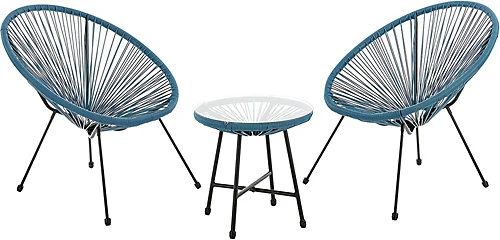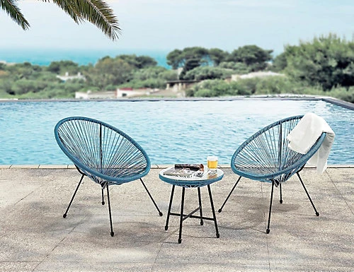 - QUAINT DESIGN The Evre Goa Furniture Set gives that perfect holiday and poolside feeling that weโve all been missing. Featuring two, super stylish, handwoven chairs and a quaint, glass topped coffee table – perfect for any size outdoor space. Sit back and relax in the cosy chairs that are interlaced with premium quality PE rattan that contours to your body shape for that optimal comfort feeling.