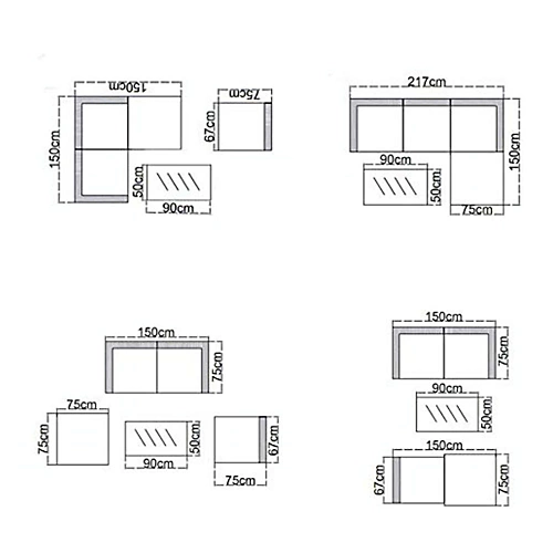 - PRODUCT DETAILS Set includes; 1 individual seat, 2 corner seats, 1 ottoman/footstool, 3 seat cushions, 3 back cushions, 1 ottoman cushion and a coffee table with glass. Furniture arrives flat-pack in 3 separate boxes and will require assembly. This is very easy and a full instruction manual is provided with the purchase. The maximum weight allowance per seat is 110kg. Dimensions are approx in cm: Individual seat: 67x75x64 (LxWxH), corner seat: 75x75x64, coffee table: 90x50x33, ottoman: 75x75x33.