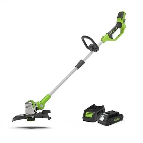 The Greenworks G24LT30M is a strong, flexible 24V grass trimmer designed for smaller lawns. Powered by an advanced 24V lithium-ion battery, the trimmer offers high performance despite its compact size. Convenience is guaranteed with no fuel or electric cables to contend with, simply insert the battery and trim.