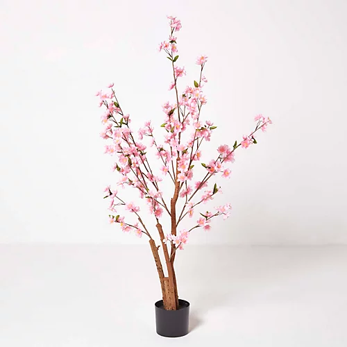 - Artificial pink blossom tree with lifelike cherry blossom petals and wood-effect stems and trunk. Measures: 130 cm tall. Pot measures: H 12.5 x W 15 cm.