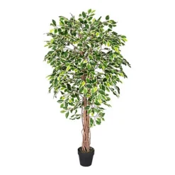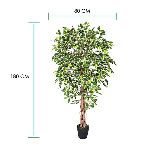 - Tall artificial variegated ficus tree with real wood twisted stem and lifelike green leaves in black pot. Size: 6ft (180cm).