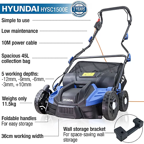 The HYSC1500E is a low maintenance electric scarifier from Hyundai, perfect for revitalising spongy lawns, fixing patchy grass growth, and encouraging drainage from areas of your lawn prone to flooding.