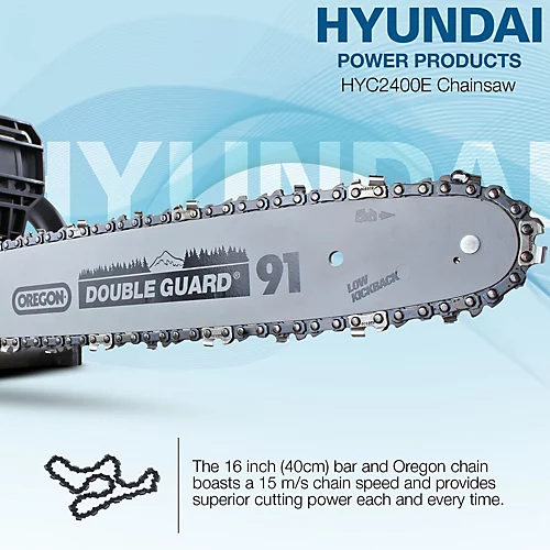 The HYC2400E is a lightweight electric chainsaw from Hyundai. Powered by a 2400W / 2.4kW motor, it is the ideal chainsaw for day-to-day woodcutting tasks including felling medium-sized trees and cutting dense logs.