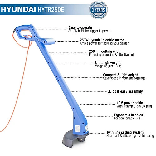 The HYTR250E is our most budget-friendly and easy-to-use corded electric grass trimmer from Hyundai, ideal for small to medium-sized gardens.