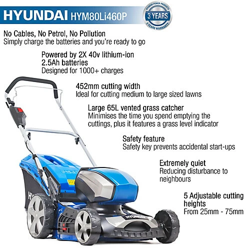 The HYM80LI460P is a rechargeable low-maintenance lithium-ion battery-powered lawn mower from Hyundai. The ideal battery-powered lawn mower for medium to large-sized lawns, this mower will bring you a clean, green, cable-free mowing experience.