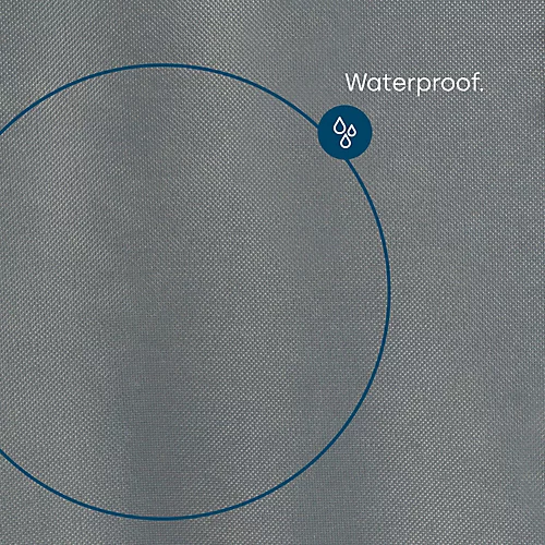 Fabricated from heavy-duty 600D waterproof PE coated polyester fabric, in an attractive neutral grey colour, it has clips to fasten to the legs of chairs and tables, as well as eyelets and drawstring for a secure and snug fit.