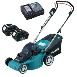 The Makita DLM380RFE is powered by two 18v Li-ion batteries in series to supply energy to the powerful 36V DC motor drive system. Comes with a battery capacity warning lamp.