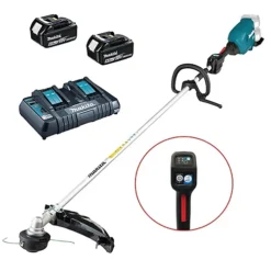 The Makita DUR369 Brushless LXT Linetrimmer is powered by two 18V LXT Li-ion batteries in series to give you a 36V machine. Ideal for landscapers and professional gardeners. Able to make quick work of large jobs with its 430mm cutting diameter. The Automatic torque Drive Technology (ADT) allows the RPM to be automatically shifted according to the density of weeds. The Actice Feedback sensing Technology (AFT) shuts down the tool to protect the user if the tool detects the rotation speed suddenly slowing down. The brush cutter also features a revese switch for easy removal of grass clippings.