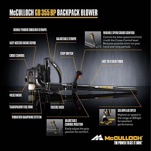 Ideal for demanding tasks the GB 355 BP is a 46cc petrol powered blower that has an power output of 1.5kW and capable of blow speeds up to 355km/h. The GB 355 BP is equipped with a back pack harness to provide the user with the upmost comfort during prolonged use. This petrol blower also features variable blow speeds, cruise control, adjustable handle position and easy to attach tubes.