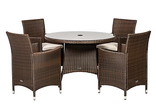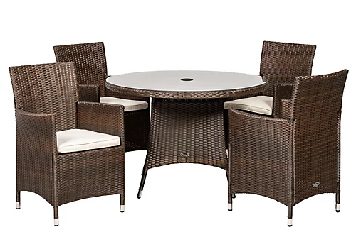The Nevada 4 seater dining set comes complete with 4 carver chairs and a tempered glass top table with a 5cm parasol hole. It is the perfect setting for outdoor lunch or evening dining or to simply relax with a drink. It is made from a galvanized steel frame and polyethylene wicker.