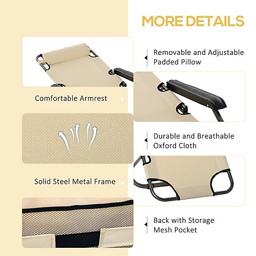 - • Item Name: Lounge • Brand Name: Outsunny• Colour: Beige • Material: Metal, Oxford Cloth • Max Load: 136 kg • Overall Dimension: 135L x 60W x 89H cm • Reclining Dimension: 178L x 60W x 29H cm • Seat Dimension: 47W x 50D x 45H cm • Foldable Size: D12 x 97L x 60.5W cm • Net Weight: 5 kg• Flat Pack: Yes • Custom Label: 84B-043BU