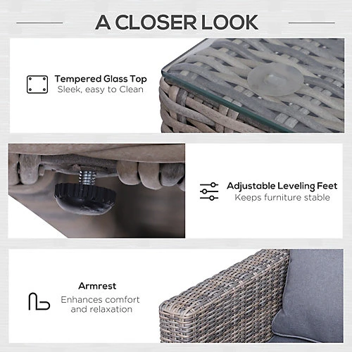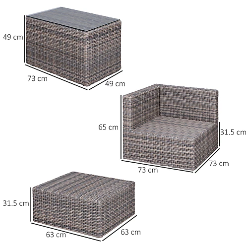 - โข Item Name: rattan sofa set โข Brand Name: Outsunny โข Color: Mix Brown Rattan, Grey Cushion โข Material: Aluminium, PE rattan, Vertical cotton, Polyester, Tempered glass โข Max Load: (Sofa)160kg, (Table)75kg โข Sofa Dimension: 73W x 73D x 65H cm โข Stool Dimension: 63W x 63D x 31.5H cm โข Table Dimension: 73L x 49W x 49H cm โข Seat Dimension: 63W x 63D x 31.5H cm โข Flat Pack: Yes โข Custom Label: 860-088