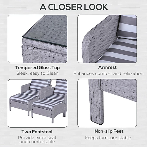 Sit back and relax in complete comfort with this 2 seater rattan sofa from Outsunny. Formed of five pieces, the set features two armchairs, two footstools and a matching coffee table. Made from hand woven PE rattan, each piece is weather resistant and low maintenance, with a steel frame underneath for extra support and stability. Two plush cushions on each chair ensure youโll be relaxing comfortably for hours this garden sofa set is a fantastic combination, comfortable and minimal hassle.