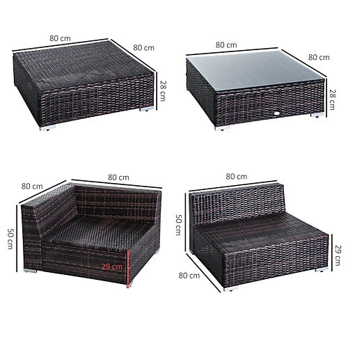 - โข Colour: Brown, Beige โข Material Used: Galvanized Metal, Polyester, PE rattan, Tempered glass โข Corner Sofa Size: 80L x 80W x 50H cm โข Middle Sofa Size: 80L x 80W x 50H cm โข Footstool Size: 80L x 80W x 28H cm โข Coffee Table Size: 80L x 80W x 28H cm โข Chair Weight Capacity:160kg โข Table Weight Capacity: 50kg โข Custom Label: 860-040