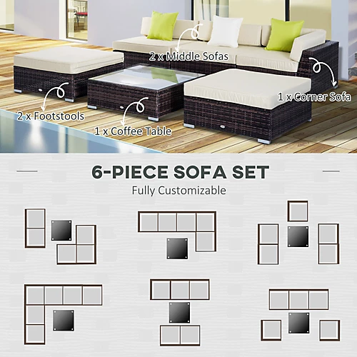 โข Modern 6 pieces detachable outdoor furniture set offers stylish and comfortable lounging at its best โข Reconfigurable set includes 1 corner section, 2 middle section, 2 footstools and 1 coffee table โข Built from a rust-resistant galvanized Metal frame with durable, weather-resistant PE rattan wicker for years of use. โข Zippered cushion filled with 10cm thick cotton for optimal comfort and relaxation. โข Washable cushion cover made from water-resistant polyester cloth for easy cleaning. โข Leveling feet adjust to help raise or lower the set on uneven ground
