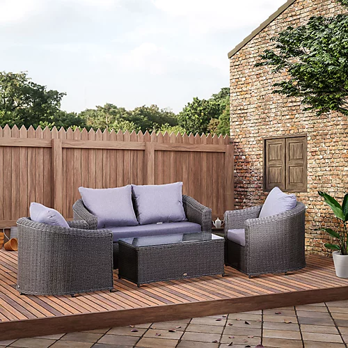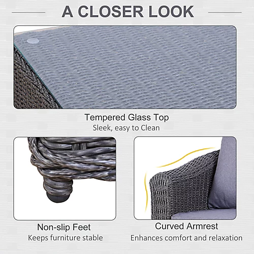 Try out this chic garden sofa set from Outsunny. Tough, stable and durable for regular use outdoors. Thick fitted seat cushions are placed on all the seats so you’ll be sitting comfortably, With a thick tempered glass top on the table for a sleek look which can be cleaned in an instant, this conservatory furniture is finished with foot pads to keep everything level and protect your floor at the same time. A great addition for any patio, conservatory and garden.