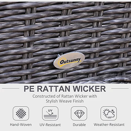 - • Item Name: Rattan Sofa Set • Brand Name: Outsunny • Colour: Grey • Material: Aluminium frame, PE rattan, Polyester, Vertical cotton, Tempered glass • Double Sofa Dimension: 147W x 80D x 75H cm • Seat Size: 108W x 65D x 32H cm • Single Sofa Dimension: 82.5W x 80D x 75H cm • Seat Size: 52.5W x 65D x 32H cm • Tea Table Dimension: 102W x 55D x 42Hcm • Net Weight: 57kg • Max. Load: (Double sofa) 220kg, (Single sofa): 160kg, (Table): 30kg • Accessories: 1 x Double sofa 2 x Single sofa 1 x Table 3 x Seat cushions 4 x Back cushions• Flat Pack: No • Custom Label: 860-083