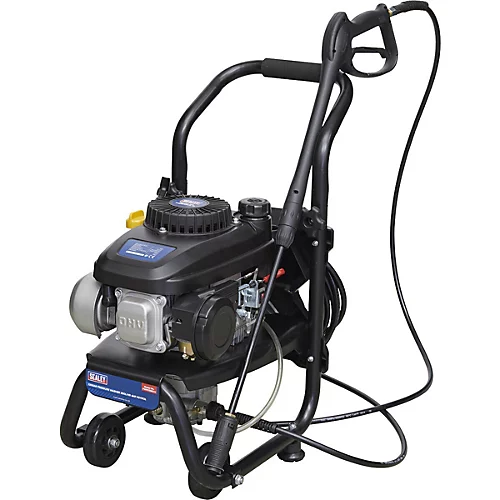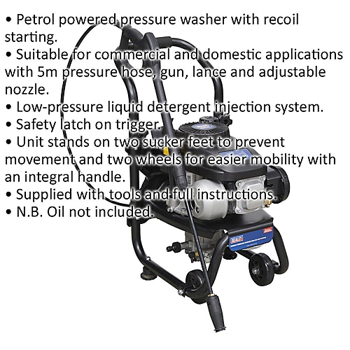 Petrol Powered Pressure Washer – 4hp Engine – 150bar – 5m Pressure HoseOverview: Petrol powered pressure washer with recoil starting. Suitable for commercial and domestic applications with 5m pressure hose, gun, lance and adjustable nozzle. Low-pressure liquid detergent injection system. Safety latch on trigger. Unit stands on two sucker feet to prevent movement and two wheels for easier mobility with an integral handle. Features: