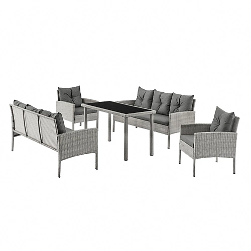 This listing is for a beautiful PE Rattan garden dining set. It is available in a stunning grey with a plush dark grey contrast cushions. Sit up to 8 people with 2x 3 seater garden sofas & 2 single chairs. Perfect for dining al fresco! The dining table comes with a black tempered glass table top for a modern look.