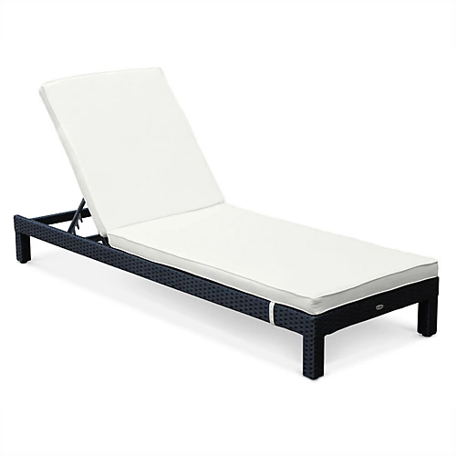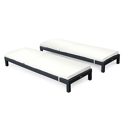 Two sun loungersAdjustable backrest 6 positionsCushion includedOriginal designExtremely comfortableStyleWith their clean and modern design the Pisa sun loungers fit in perfectly on various styles of terraces. These sun loungers will adapt to your mood thanks to their reclinable backrests. The Pisa set is guaranteed to be comfortable thanks to its 6cm cushions with removable covers. The cushions fit the shape of the loungers and have a hood and a strap so that they will always stay in place.QualityThe black and grey Pisa loungers can be set up near a pool. They are made from polyrattan. This material is resistant to bad weather and UV rays. The Pisa’s frame is made from reinforced aluminium. This is proof of their longevity as it does not rust. It is also much lighter than traditional steel frames.Rattan colour: BlackCushion colour: Off whiteFrame material: AluminiumMaterial: Woven polyrattan2x sun lounger: L195 x W65 x H28/84cm 13kgMaximum weight supported: 110 kgSeat height: 28 cm