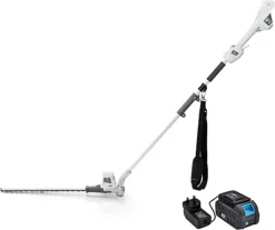 The long hedge trimmer is simple to operate, with one-handed trigger and safety switch which could effectively prevents accidental operation. The soft grip handles and shoulder harness give more comfort while cutting. Split aluminum shaft makes this wireless cutter easy to compact storage when not in use.