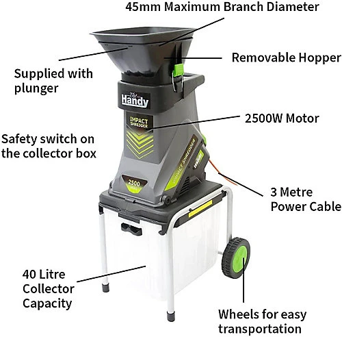 The Handy Electric Impact-Shredder shreds branches up to 45mm in diameter. β can all be reduced to a mulch that will prove easy to dispose of; and which will act as an effective compost for your flowerbeds and veg plot!