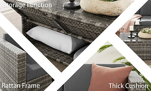 Made of PE rattan wicker which has the advantages of being UV-resistant to prevent fading and cracking caused by sunlight. The metal frame provides a stronger structure but is also lightweight and is powder-coated to prevent rust and other corrosion. Able to fit a variety of living space styles and settings. It’s a handsome decor to your outdoor patio, garden, backyard, poolside or yard. It brings a stylish and relaxing atmosphere, classic style is never out of date. Includes: 1 x One Seat Corner Sofa, 1 x Two Seat Corner Sofa- Left, 1 x Two Seat Corner Sofa -Right, 1 x Storable Coffee Table, 2 x Pillows and All cushion. All tool was provided in the package. Made from all-weather garden fabric to withstand British weather