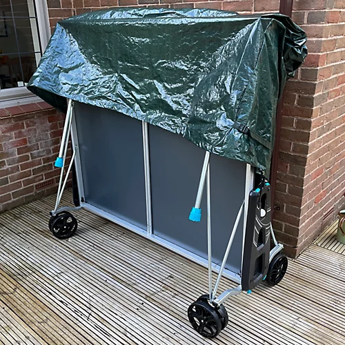Protect your table tennis table from dust, dirt, and the elements with our waterproof cover. Made from 100gsm polyethylene, the cover is easily washable and folds away when not in use. Sturdy stitched seams add strength to the cover, and it can be fixed in place by way of a nylon drawstring, and a strap with buckle for twice the peace of mind. The cover measures 165cm wide by 185cm tall. The depth at the base is 70cm and it tapers to 30cm at its peak. Whilst our waterproof cover wonโt help you improve your ping pong game, itโll certainly help protect your playing surface.